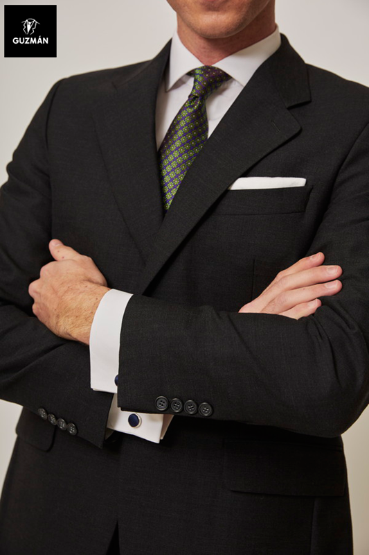 El traje gris marengo ofrece un look elegante y a la vez actual, dependiendo de los complementos utilizados. Luce muy bien con una corbata de topos verde y azul con gemelos a juego. También para un evento diurno utilizando una corbata en tonos claros, como el azul, combinado con una camisa blanca de puño doble. En cambio, si lo utilizamos para un acto vespertino o nocturno, un traje negro con corbata de topos en azul y rojo será la opción más conveniente.