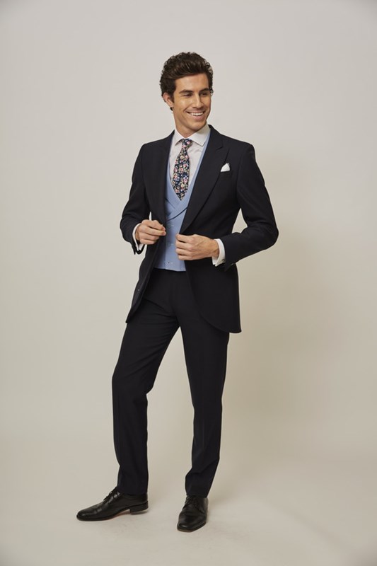 Si buscas un look más desenfadado, puedes elegir ese mismo traje en azul marino, pero cambiando los complementos. En este caso una corbata con estampado floral combinada con un chaleco en azul celeste será una gran elección. Otra opción es elegir un chaleco cruzado escocés en rojo, celeste o azul marino. Los tonos muy claros como el rosa o intensos como el amarillo, también ofrecen una combinación diferente a lo convencional.
