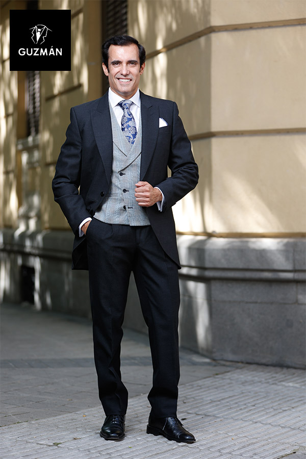 El azul tinta y azul plomo continúan siendo la elección estrella: elegantes, versátiles y adecuados tanto para bodas de día como de noche. El gris medio es otra opción clásica y sobria, mientras que el negro conserva su lugar como el tono más formal, ideal para enlaces nocturnos o muy tradicionales.